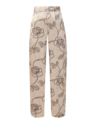 Элегантные брюки-палаццо в бежевой гамме от Re Vera. Модель создана из шелка с легким сатиновым блеском, струящийся материал идеально подходит для создания повседневных и вечерних образов. Высокий эластичный пояс визуально моделирует силуэт. Детали: прорезные карманы, флористический принт.