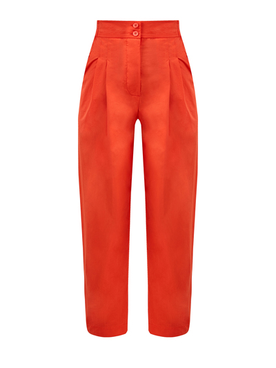 Женские брюки зауженного кроя от Gentryportofino созданы из дышащей хлопковой ткани. Однотонное исполнение и лаконичный дизайн делают модель универсальным дополнением повседневных образов. Изделие на высокой посадке дополнено двумя прорезными карманами и фактурными защипами. Детали: эластичная вставка на поясе, застежка на пуговицы и молнию. Сделано в Италии.