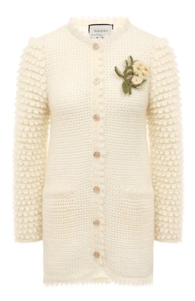 Кремовый кардиган мастера марки, основанной Гуччио Гуччи, связали из нежной пушистой мохеровой пряжи, которую укрепили прочным нейлоном. Сочетание тонких нитей и техники кроше придают модели с круглым вырезом и объемными рукавами легкость и воздушность. Изделию добавили романтичности, украсив цветочной композицией, словно совершившей экспансию с архивного мотива Flora.