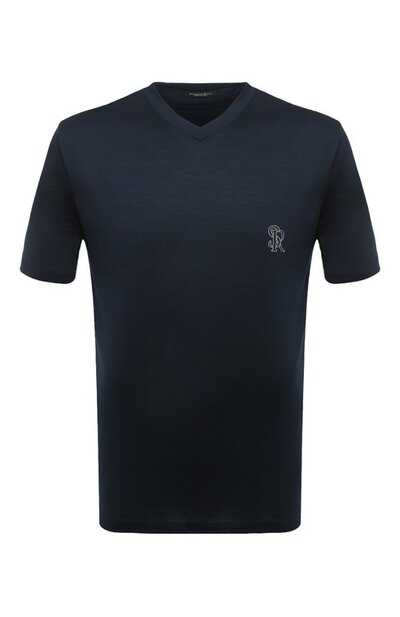В темно-синей футболке с V-образным вырезом и короткими рукавами будет комфортно в течение всего дня. Для пошива модели использовали мягкое легкое джерси, связанное из отборных волокон премиального хлопка. Нити отполировали до идеальной гладкости, поэтому материал получился таким же приятным на ощупь и при этом прочным, как шелк. Спереди вышили монограмму из инициалов Стефано Риччи.