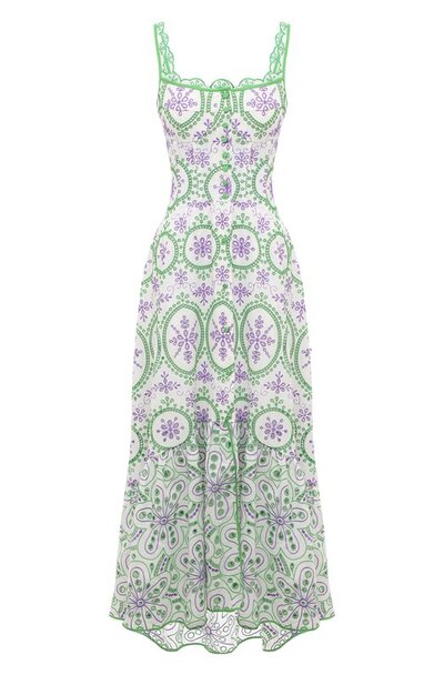 При создании этого сарафана Чаро Руиз возвела женственность в абсолют. Общее впечатление о модели складывается из деталей: приталенного силуэта с корсетным лифом, асимметричного подола, фестонов, подчеркивающих бретели и вырез. А главная особенность изделия — ажурный цветочный орнамент, вышитый на молочно-белом хлопке сиреневыми и зелеными нитями.