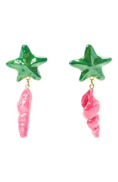 Эти длинные клипсы из позолоченного ювелирного сплава словно собраны из сувениров, привезенных с южного побережья. Зеленая основа имитирует морскую звезду, а нежно-розовую подвеску почти не отличить от витой раковины. Оба фигурных элемента покрыты эмалью с глянцевым блеском, поэтому кажутся еще ярче.