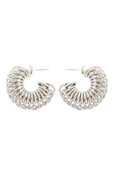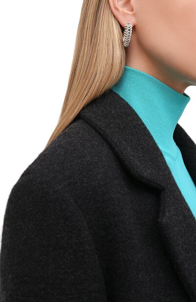 Серьгам с застежкой-пусет задали форму несомкнутого кольца и стилизовали их под резинку для волос. Эффект пружин создали переплетением миниатюрных деталей, каждую из которых мастера марки тщательно отполировали до идеальной гладкости и глянцевого блеска. Для производства украшения использовали серебро 925 пробы.