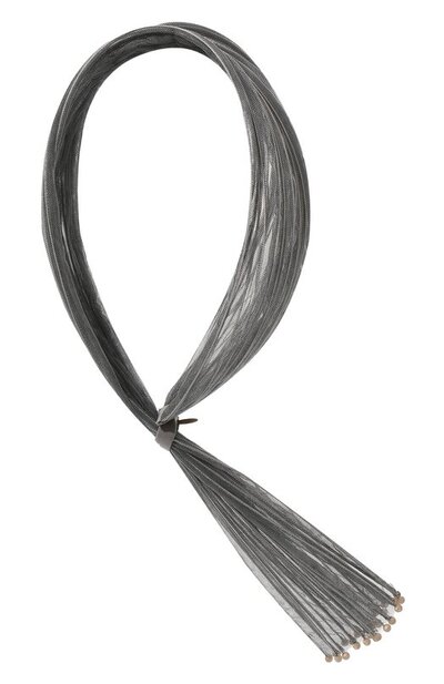 Серое колье даже простой повседневный образ сделает более утонченным и поэтичным. Серебристо-серую модель, напоминающую узкий шарф, завязанный на французский узел, создали из тончайшего шелкового тюля. Чтобы регулируемый аксессуар лучше держал форму, его усилили тонкими стальными спицами, концы которых декорировали перламутровыми бусинами, стилизованными под жемчуг.