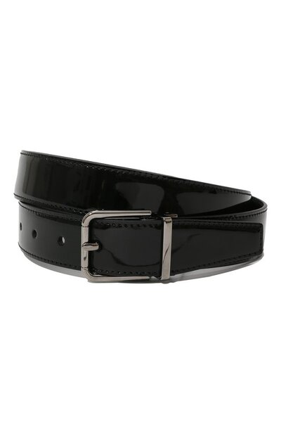Для изготовления черного ремня классической ширины мастера марки использовали гладкую лакированную кожу. Ее глянцевому блеску вторит холодное сияние рутениевого покрытия на квадратной роликовой пряжке из полированного металла. Из такого же материала выполнили узкий тренчик с выгравированным логотипом.