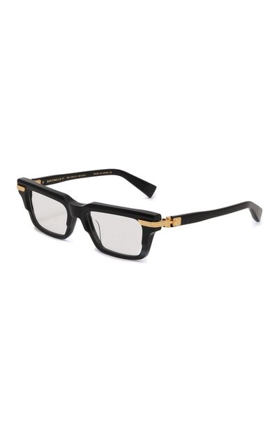 Мастера марки использовали для изготовления черной оправы почти невесомый ацетат, отполированный до глянцевого блеска. Фигурные крепления с фактурным узором и эмблемой бренда выполнили из легкого и при этом прочного титана с золотистым напылением.