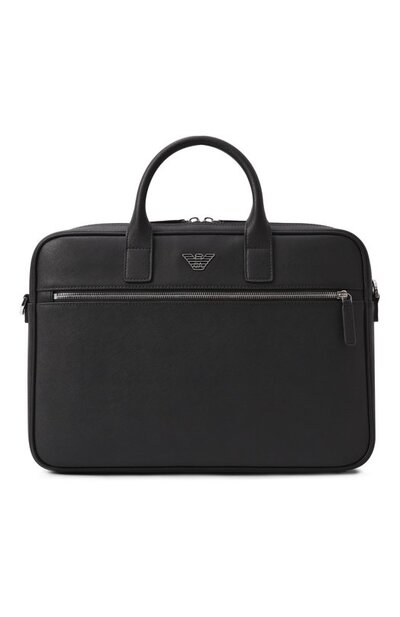 Черную сумку для ноутбука сшили из матовой сафьяновой экокожи, которая не боится царапин и надежно защищает содержимое от влаги. Аксессуар с двумя ручками и брендированным плечевым ремнем украшен небольшой эмблемой бренда, основанного Джорджо Армани. Внешний карман, как и внутреннее отделение, застегивается молнией.