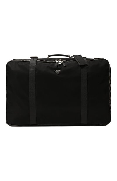 Черную дорожную сумку стилизовали под чемодан с одним отделением, дополненным перекрещивающимися регулируемыми ремнями. Для создания аксессуара использовали прочный непромокаемый нейлон, который легко очищается от загрязнений. Отделку, ремни и две короткие ручки выполнили из мягкой сафьяновой кожи. Чтобы модель с внешним карманом на молнии было легче перемещать, предусмотрели два бесшумных колеса.