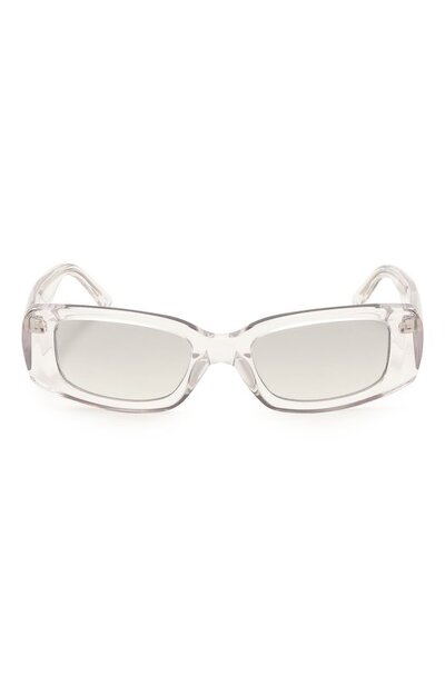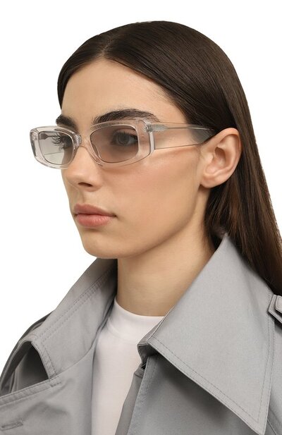 Солнцезащитные очки со слегка наклоненными плоскими линзами полностью блокируют вредные для глаз ультрафиолетовые лучи. Легкая прозрачная оправа с широкими дужками изготовлена вручную из глянцевого ацетата Mazzucchelli. Изделия из такого материала почти не ощущаются на лице, не раздражают кожу и не темнеют от воздействия косметики.