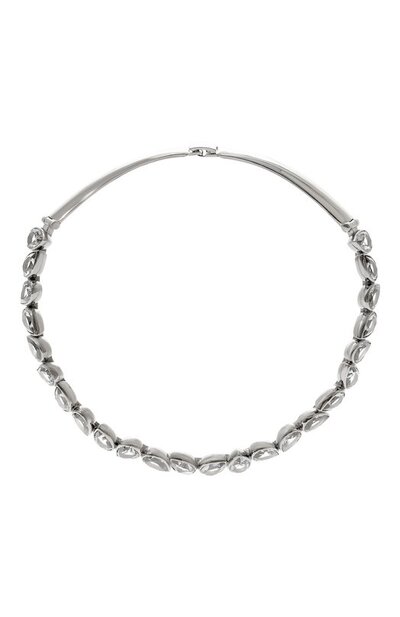Серебристое колье, стилизованное под чокер с жестким основанием, выполнили из легкого ювелирного сплава. Материал покрыли белым прочным родием, поэтому не потускнеет со временем. В каплевидные звенья вставили прозрачные фианиты, создающие на шее фигурную искристую дорожку.