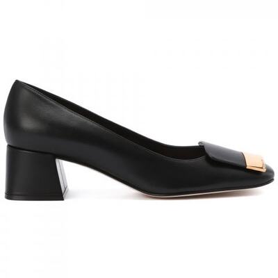 Туфли от Sergio Rossi из чёрной кожи. Эти новые туфли-лодочки с квадратным носком выполнены из элегантной однотонной чёрной наппы с массивным каблуком, что делает их незаменимыми в этом сезоне. Язычок с характерной золотой пластиной добавит блеска любому наряду. Эти туфли идеально дополнят офисный образ, а благодаря невысокому каблуку ваши ноги не устанут даже в самый напряжённый день. Квадратный каблук высотой 45 мм. обтянут кожей в тон, подошва и стелька выполнены из натуральной кожи.