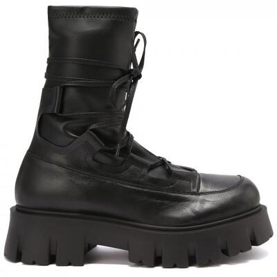 Черные ботинки с эффектной шнуровкой помогут разнообразить повседневные образы. Модель выполнена из натуральной кожи, на резиновой подошве с выразительным протектором. Внутри пара утеплена подкладом и стелькой из шерсти. Посадку регулирует шнуровка. Ботинки легко сочетать как с брюками, так и с платьями, создавая дерзкие образы