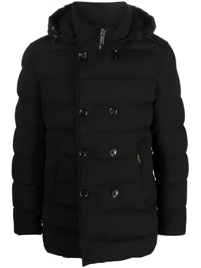 black down-feather filling padded design quilted classic hood front button and zip fastening long sleeves two side slit pockets straight hem