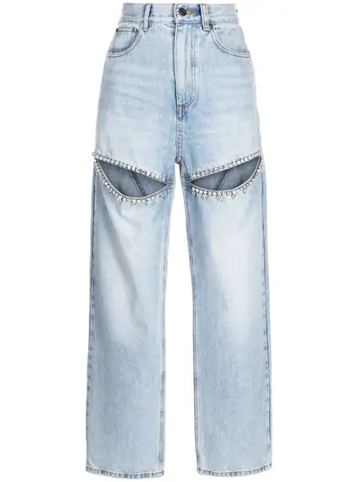 light blue cotton denim washed denim whiskering effect cut-out detailing crystal embellishment belt loops concealed fly and button fastening two rounded pockets to the sides rear patch pocket straight leg