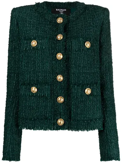 forest green tweed gold-tone hardware collarless front button fastening long sleeves shoulder pads four front patch pockets straight hem