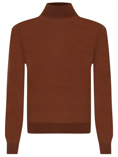 -Водолазка из кашемира и шелка терракотового оттенка от COLOMBO. -Модель полуприлегающего силуэта с длинными рукавами, рельефными манжетами, поясом и высоким воротником с отворотом.