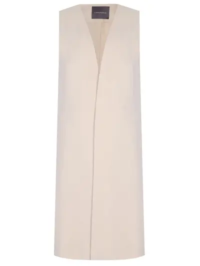 -Бежевый удлиненный жилет купажированного состава от LORENA ANTONIAZZI. -Модель прямого кроя с V-образным вырезом на груди дополнит образы в классическом варианте с брюками и блузами или рубашками.