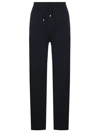 -Темно-синие трикотажные брюки из смесового хлопка от LORENA ANTONIAZZI. -Модель с рельефными манжетами в нижней части брючин, карманами по бокам, контрастными лампасами и широким эластичным поясом на кулиске, который поможет скорректировать посадку.