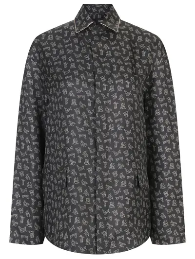 -Черная с принтом рубашка из шелка от GOOROO. -Модель свободного кроя со спущенной линией плеча, длинными рукавами, отложным воротником, прорезными карманами с клапанами, супатной застежкой на пуговицы.
