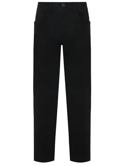-Модель зауженного кроя со стандартной посадкой, поясом со шлевками, прорезными и накладными карманами, застежкой на молнию и пуговицу, нашивкой с логотипом бренда.