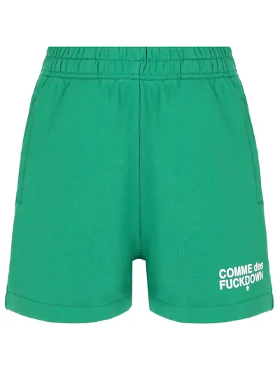 -Зеленые шорты из мягкого хлопка от COMME DES FUCKDOWN. -Модель с эластичным поясом для выбора комфортной высоты посадки, прорезными карманами и логотипом на бедре.