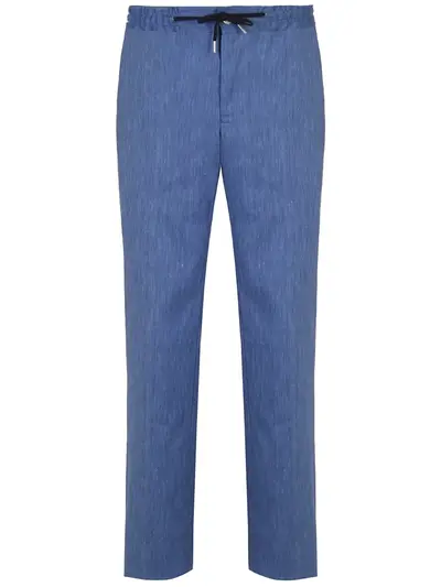 -Голубые брюки из микса льна и шерсти от CASTANGIA. -Модель с эластичным поясом на кулиске для выбора комфортной высоты посадки, тремя прорезными карманами, застежкой на молнию и пуговицу.