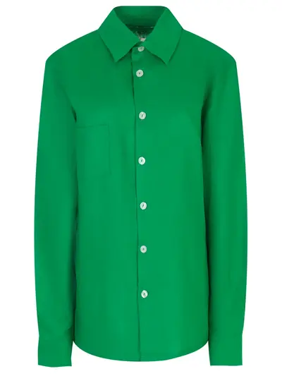 -Зеленая рубашка изо льна от LEAH. -Модель свободного кроя со спущенной линией плеча, длинными рукавами с манжетами, отложным воротником, нагрудным накладным карманом, застежкой на пуговицы.