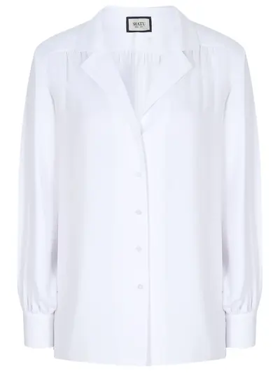-Белая блуза купажированного состава от SHATU. -Модель свободного кроя с длинными объемными рукавами, широкими манжетами, отложным воротником, застежкой на пуговицы, кокеткой на спинке.