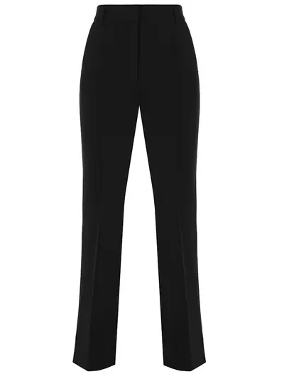 -Черные брюки из смесовой вискозы от DOROTHEE SCHUMACHER. -Модель полуприлегающего кроя с завышенной посадкой, поясом со шлевками, прорезными карманами, застежкой на молнию, графичными стрелками, которые визуально вытягивают силуэт.