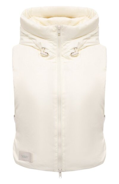 Белый жилет стилизовали под нагрудник, заменив боковые швы широкими эластичными лентами. Для пошива модели с регулируемым капюшоном использовали прочный непромокаемый нейлон, а чтобы адаптировать ее к прохладной погоде, дополнили слоем почти невесомого утиного пуха. Он не создает объем, поэтому изделие можно носить как утепляющий слой под тонким пальто или плащом.