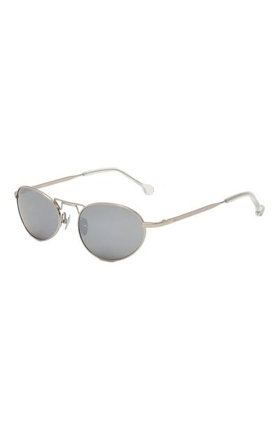 Серебристые солнцезащитные очки изготовили из ультратонкого прочного металла, поэтому они выглядят воздушно. Овальные линзы с зеркальным покрытием полностью блокируют ультрафиолет, не искажая цветопередачу. Двойной мост и подвижные носоупоры обеспечивают комфортную посадку аксессуара с полупрозрачными ацетатными заушниками и на женском, и на мужском лице.