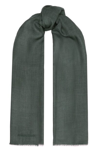 Для изготовления темно-зеленого шарфа мастера марки использовали тонкий кашемир. Такой материал в несколько раз теплее, легче и мягче обычной шерсти. Один из краев украсили логотипом бренда, вышитым в тон, а края деликатно подчеркнули короткой бахромой.