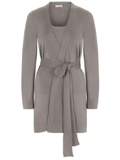-Кардиган со свободным запахом пол, которые фиксируются поясом на талии, подчеркивая ее и структурируя силуэт.