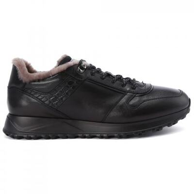 Чёрные зимние кроссовки подойдут для повседневных образов. Модель выполнена из натуральной кожи, на резиновой подошве. Внутри пара утеплена подкладом и стелькой из натурального меха. Фактурная кожаная вставка и меховая опушка станут акцентами, которые внесут разнообразие в базовые образы.