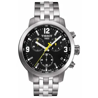 Мужские швейцарские часы Tissot (Тиссот) TISSOT PRC 200 CHRONOGRAPH T055.417.11.057.00. Спортивный кварцевый хронограф с 30-минутным счетчиком и счетчиком десятых долей секунд, центральная 60-секундная стрелка хронографа, суммарный и сплит-хронограф, диаметр циферблата 42 мм, толщина 12 мм. Имеется функция даты. Корпус и браслет из нержавеющей стали 316L. Устойчивое к появлению царапин сапфировое стекло, цвет циферблата черный. Водонепроницаемость до 20 бар (200 м / 660 футов) – часы идеально подходят для занятий водными видами спорта. Страна - производитель Швейцария, гарантия 2 года. Данную модель можно приобрести в сети часовых салонов «4 Измерение» или заказать на сайте «Четвёртое Измерение».Название коллекции расшифровывается как точность (Precise), надёжность (Robust) и классический (Classic), а цифры – водонепроницаемость до 200 метров. С более тонким безелем циферблат кажется очень широким, что позволяет легко считывать время. Этому же способствует светонакопительное покрытие Superluminova, которым выделены деления и конические стальные стрелки циферблата. Арабские крупные цифры и тахиметрическая шкала на фланце придают часам спортивный и современный стиль. Хронограф позволит вам замерять короткие промежутки времени при занятиях спортом, в том числе и водными видами спорта, ведь завинчивающиеся заводная головка и задняя крышка часов позволяют не беспокоиться о водозащищённости. Стальной корпус часов с контрастным брутальным чёрным цветом циферблата, на котором ярко выделяются желтые стрелки хронографа в сочетании сбраслетом и безопасной застежкой с удлинением для дайверов, как нельзя лучше подойдут для спортивного стиля. Международная гарантия, которая выдается на все часы Tissot, действует более чем в 160 странах, а это значит, что вы сможете обслуживать часы в любой точке мира. Часы PRC 200 – настоящий лидер продаж в коллекции Tissot.Вы обязательно найдете «свою» модель в семействе Tissot PRC 200.После грандиозного успеха линейки спортивных часов Tissot PRS 200 компания Tissot решила закрепить успех и продолжила модельный ряд этой коллекции выпуском нового спортивного хронометра Tissot PRC 200, обладающего высоким уровнем водонепроницаемости - 20 бар (200 м/660 футов) и элементами классического дизайна.За счет сужения безеля был значительно увеличен циферблат, что в итоге ускоряет и упрощает процесс считывания информации.Этому же способствует применение светонакопительного покрытия Superluminova, которым выделены деления и конические стальные стрелки циферблата.Артикул браслета - T605031423.
