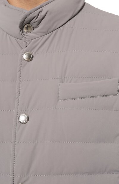 Серый жилет прямого кроя станет удачным выбором для прогулок в прохладную погоду. Мастера марки, основанной Брунелло Кучинелли, выполнили модель из легкого нейлона с мембраной, который защищает от ветра и дождя. По стеганым камерам равномерно распределили легкий пух с добавлением пера, которые поддерживают комфортный микроклимат.