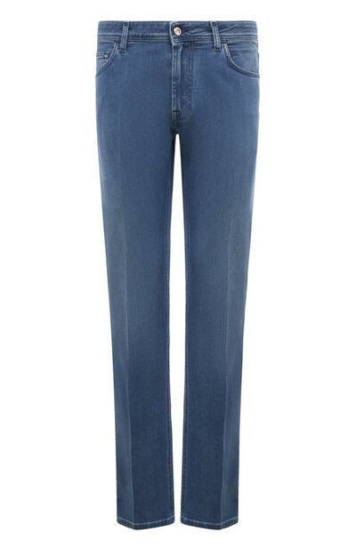 Голубые джинсы с небольшими потертостями скроены зауженными, поэтому способны визуально вытянуть силуэт. Зрительную вертикаль выстраивают и графичные стрелки, как у формальных брюк, которые заложены на плотном и вместе с тем мягком хлопке с длинными волокнами. Чтобы модель не сковывала движения, мастера марки, основанной Стефано Риччи, вплели в деним стрейчевые нити.