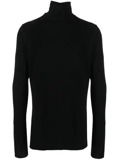 jet black cotton-modal blend contrast stitching frilled high neck long sleeves thumb slots straight hem