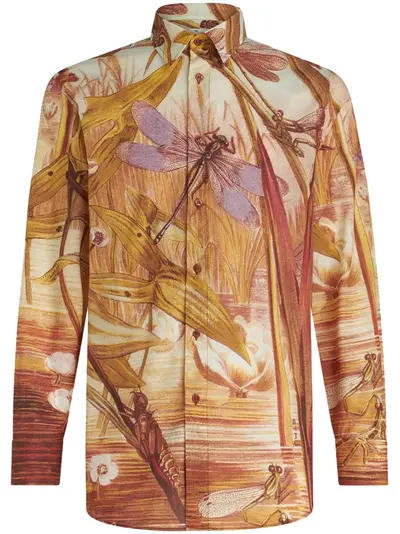 auburn brown/multicolour cotton landscape print classic collar front button fastening long sleeves buttoned cuffs curved hem