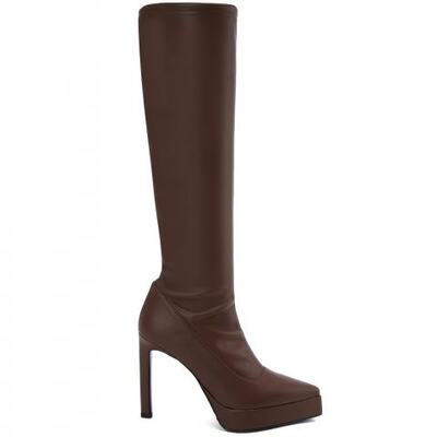 Сапоги из искусственной кожи в коричневом цвете от Principe di Bologna. Модель выполнена из чёрной эластичной кожи, на платформе и высоком каблуке. Чёрный цвет и форма каблука делают эту пару нескучной и подходящей для создания особенных образов. Подкладка и стелька выполнены из натуральной кожи.