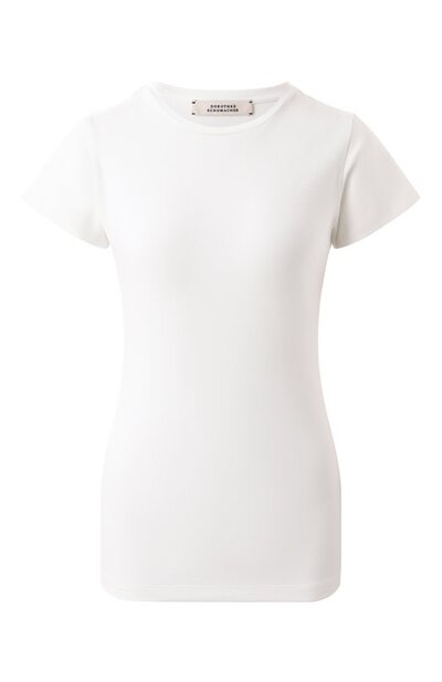 Белая футболка с круглым вырезом и короткими рукавами почти не ощущается на теле, отлично пропускает воздух и комфортно облегает тело, не сковывая движения. Доротея Шумахер выбрала для создания однотонной легкой модели эластичное хлопковое джерси с гладкой шелковистой текстурой.