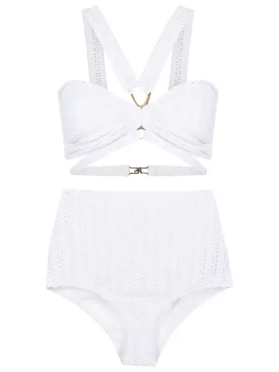 white stretch-design Top: textured finish cut-out detailing V-neck gold-tone hardware gathered detailing underwire cup rear clip fastening Bottom: high waist full coverage full lining Be mindful to try on swimwear over your own garments.