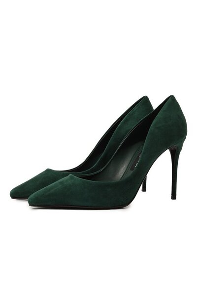 При создании темно-зеленых туфель Cardinale, представленных эксклюзивно в ЦУМе, Доменико Дольче и Стефано Габбана обошлись настолько деликатно, насколько это было возможно, украсив лишь основание высокой шпильки небольшой золотистой монограммой DG. Для пошива модели с зауженным мысом и глубоким вырезом дизайнеры выбрали мягкую бархатистую замшу тонкой выделки.