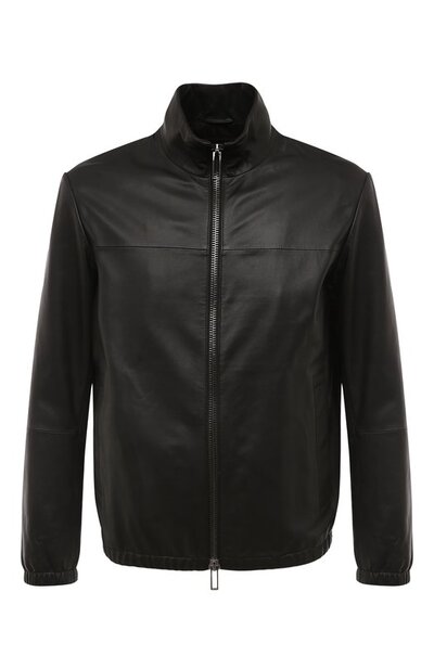 Для пошива черной куртки с воротником-стойкой дизайнеры марки выбрали мелкозернистую кожу наппа, фактуру которой подчеркнули легким блеском. Материал предварительно тщательно обработали, чтобы сделать его более мягким и пластичным. Модель с эластичными манжетами и поясом застегивается встречной молнией.