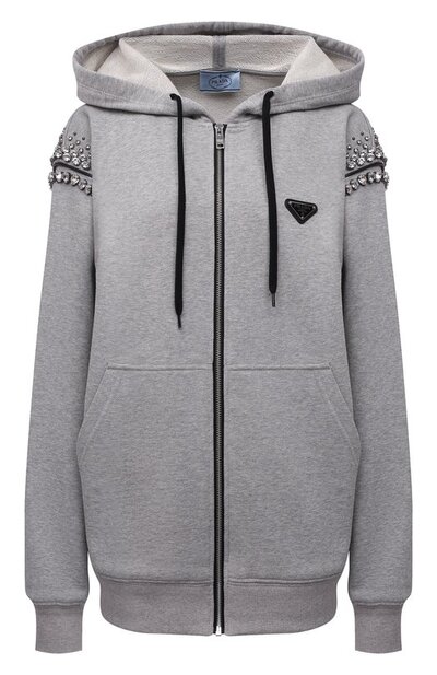 Миучча Прада и Раф Симонс включили в коллекцию сезона осень-зима свою версию кардигана. Модели в спортивном стиле они добавили блеска: из заклепок и прозрачных кристаллов вдоль спущенной линии плеч выложили геометрический узор. Бликами он перекликается с треугольным патчем на груди. В изделии из плотного хлопкового трикотажа с фактурной изнанкой будет комфортно и теплым днем, и прохладным вечером.