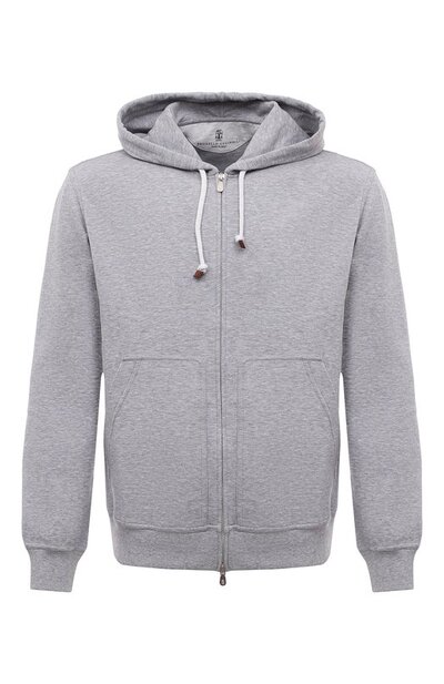 Толстовка с парой карманов спереди станет альтернативой легкой куртке. Модель из футера на основе хлопка, укрепленного нейлоновыми нитями, застегивается встречной молнией, пуллеры которой украсили эмблемой Solomeo.