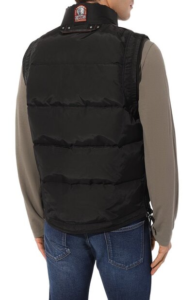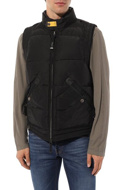 Для пошива черного жилета с воротником-стойкой использовали мягкий шелковистый нейлон, не боящийся дождя и ветра. Легкий утиный пух, равномерно распределенный по стеганым камерам, эффективно сохраняет тепло, не давая холоду проникнуть внутрь. Модель станет хорошей альтернативой легкой куртке в прохладную погоду.