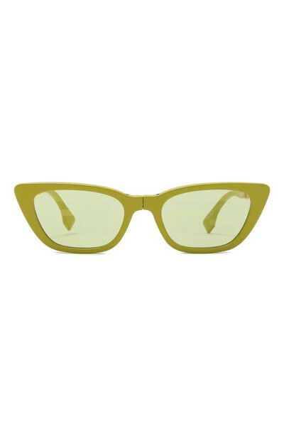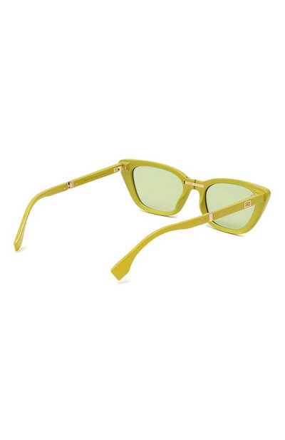 Складные солнцезащитные очки насыщенного зеленого цвета выполнили из глянцевого ацетата, который почти ничего не весит. Оттенок оправы поддержали линзами, которые украсили монограммой FF, повторив форму замка знаковой сумки Baguette. С эмблемой перекликаются миниатюрные золотистые вставки на узких дужках.
