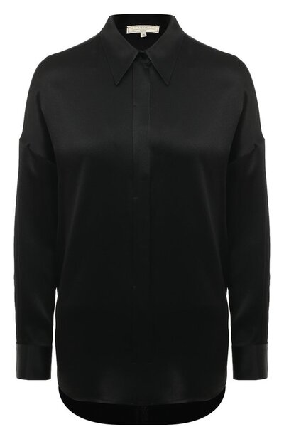 Угольно черная рубашка с длинными рукавами, заниженной линией плеч и отложным воротником сшита из гладкого мягкого атласа с шелковистой текстурой. Тонкая ткань почти не мнется и отлично пропускает воздух, а продуманный крой гарантирует свободу движений.