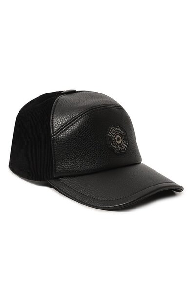 Черную бейсболку скомбинировали из материалов с контрастной фактурой. Для изготовления головного убора использовали мягкий хлопковый вельвет и зернистую кожу, рельеф которой подчеркнули легким блеском. Тулью украсили фигурным патчем с логотипом и эмблемой бренда.